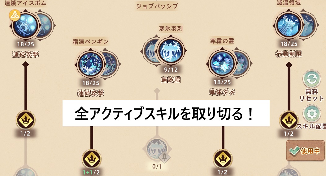 スキル振りは簡単なようで奥が深いです。適当に振っては火力は上がりません。ポイントは2つ。