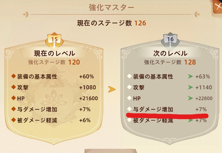 強化スクロールを使って装備を強化するのも重要です。強化マスターレベルが上がるごとに与ダメージ増加を向上できます
