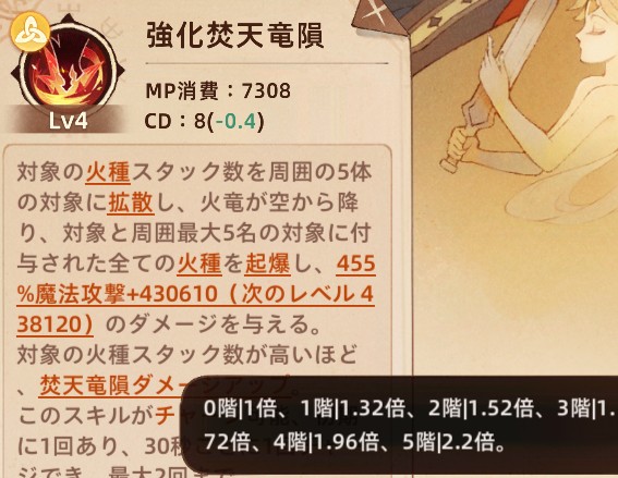 例えば炎龍の竜隕は通常は弱いですが、火種を5つ貯めると威力が2.2倍に跳ね上がります